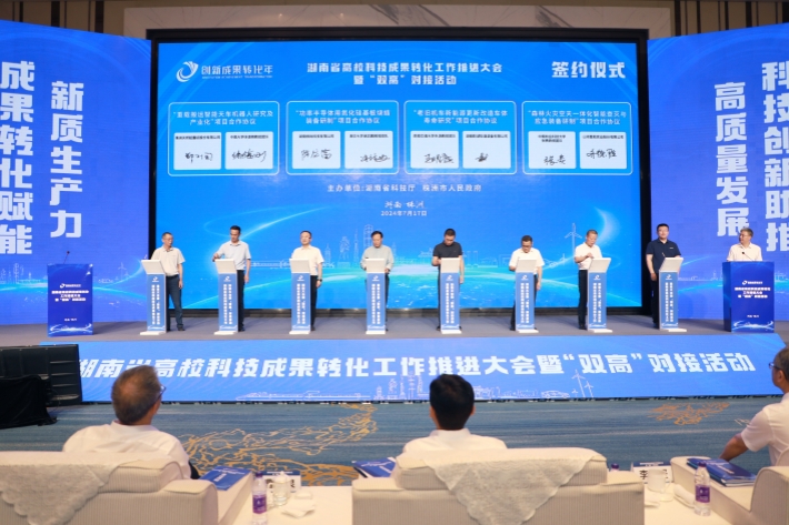 7月17日,湖南省高校科技成果转化工作推进大会暨“双高”对接活动在株洲举行。副省长曹志强、省科学技术厅党组书记李志坚、株洲市委书记曹慧泉等领导出席。中科院、中南大学等省内外高新区(高新区内企业)、高校以及相关企业、机构代表等300余人参加活动。会上发布了全省高校科技成果转化指数、全省企业技术需求;8个全省高新区(高新区内企业)与高校“双高”对接项目现场签约;高校、园区、企业、机构代表分别作交流发言。我校成果转化中心周波副主任、前沿交叉学科学院张贵教授、易积政副教授,电物学院周凯副教授和林学院李红庆副教授参加了此次对接活动。