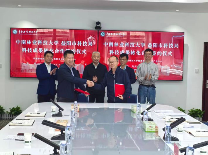座谈会后,签约仪式正式举行。在闫文德副校长、刘伟丰书记的共同见证下,夏换主任代表中南林业科技大学,龙闻生副局长代表益阳市科技局,共同签署共建 “中南林业科技大学益阳市成果转化分中心” 协议。此次签约标志着双方校地科技合作迈入新阶段,将为高校科研成果与地方产业需求精准对接搭建重要平台,助力益阳产业升级与中南林科大科技成果落地转化实现双向共赢。