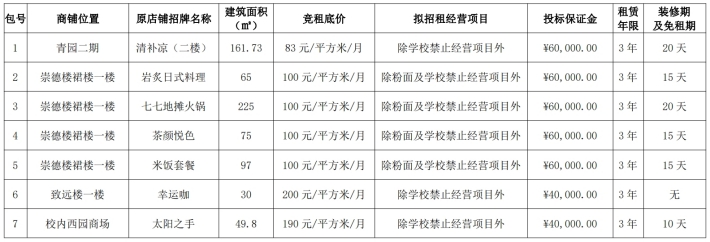 1.1项目名称:中南林业科技大学青园二期、崇德楼裙楼一楼、致远楼一楼、校内西园商场商铺招租